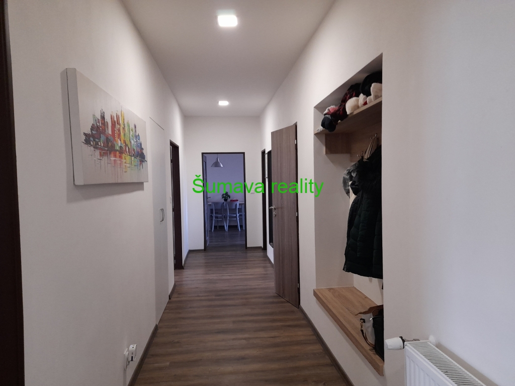 Chodba – 3x led stropní světlo, 2x vestavěná skříň, věšák s policí a sezením, telefon ke zvonku, radiátor.