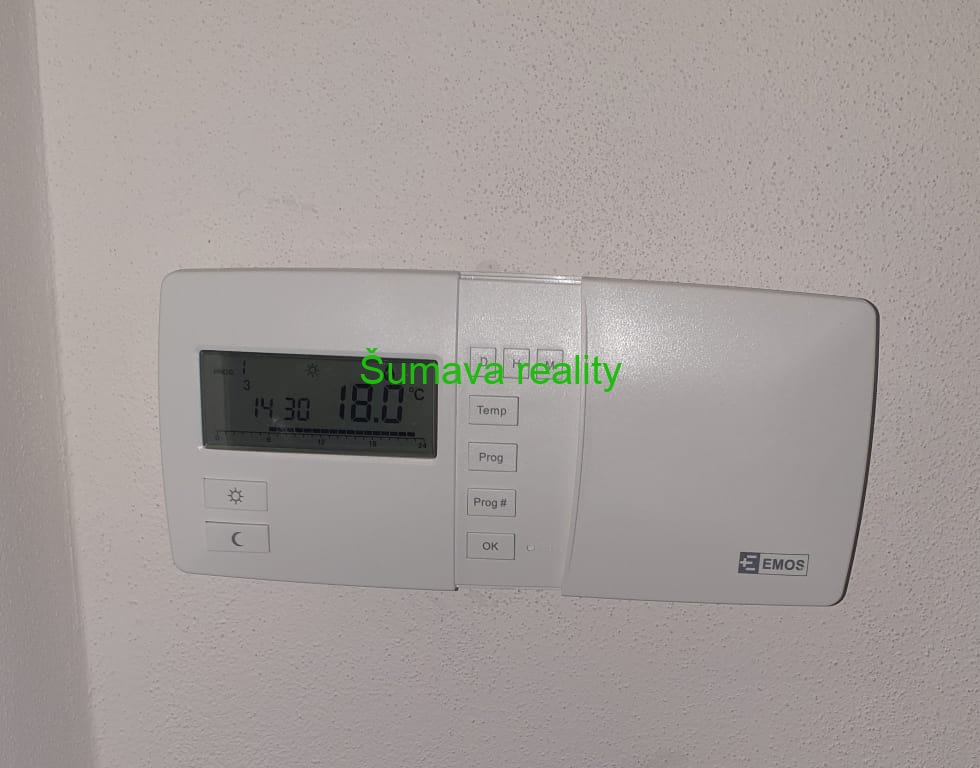 Pokoj č. 1 – termostat zn. Emos, 2x nerezová dvojitá garnýž, 4x bodové světlo, 1x stropní led světlo na dálkové obládání, 2x radiátor